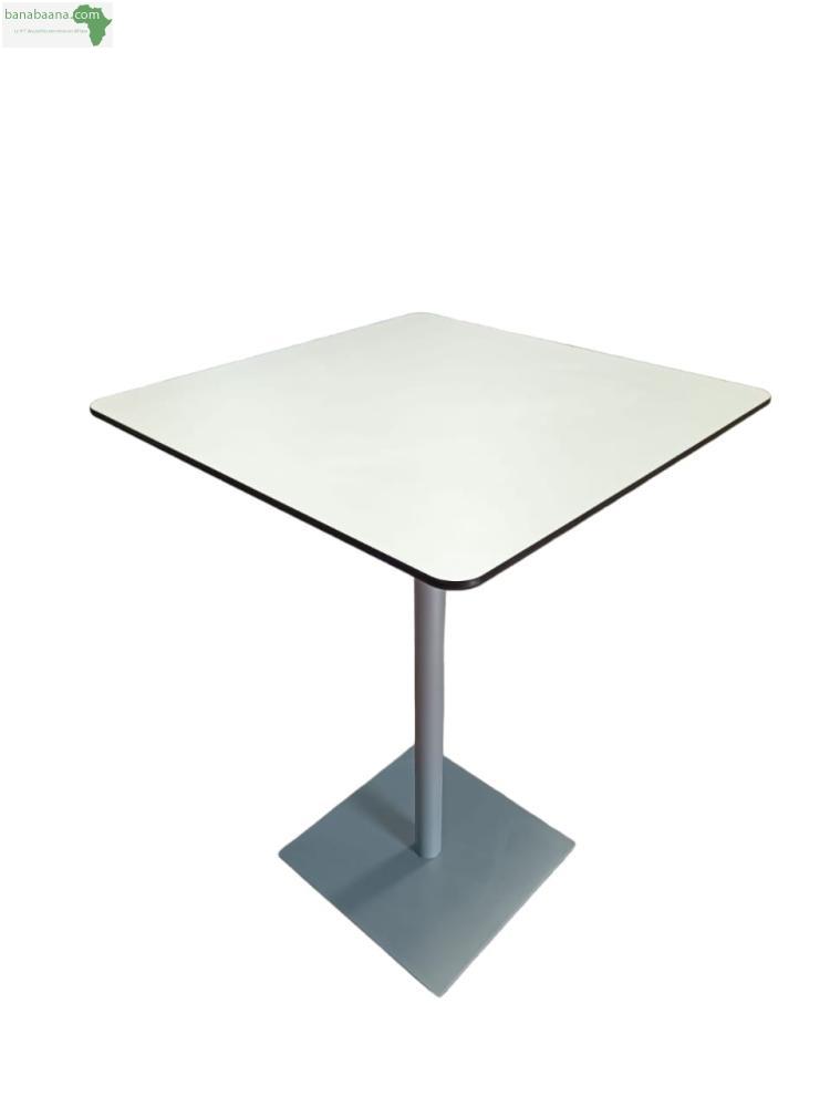 TABLE HAUTE CARRE PLATEAU EN BOIS STRATIFIE DE COULEUR BLANC REPOSANT SUR UN PIETEMENT COLONNE ET BASE CARRE EN INOX POLI.