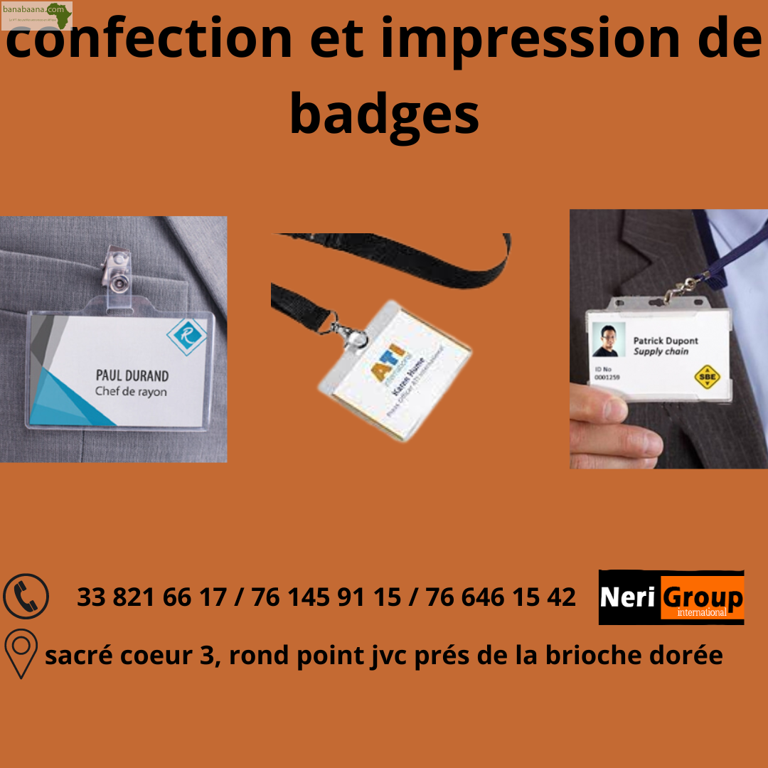 Nous vous offrons une confection et impression de badges de qualité. Badge PVC Recto à 1.500 f ; Badge PVC Recto-verso à 2.500 F. LIVRAISON À VOS FRAIS