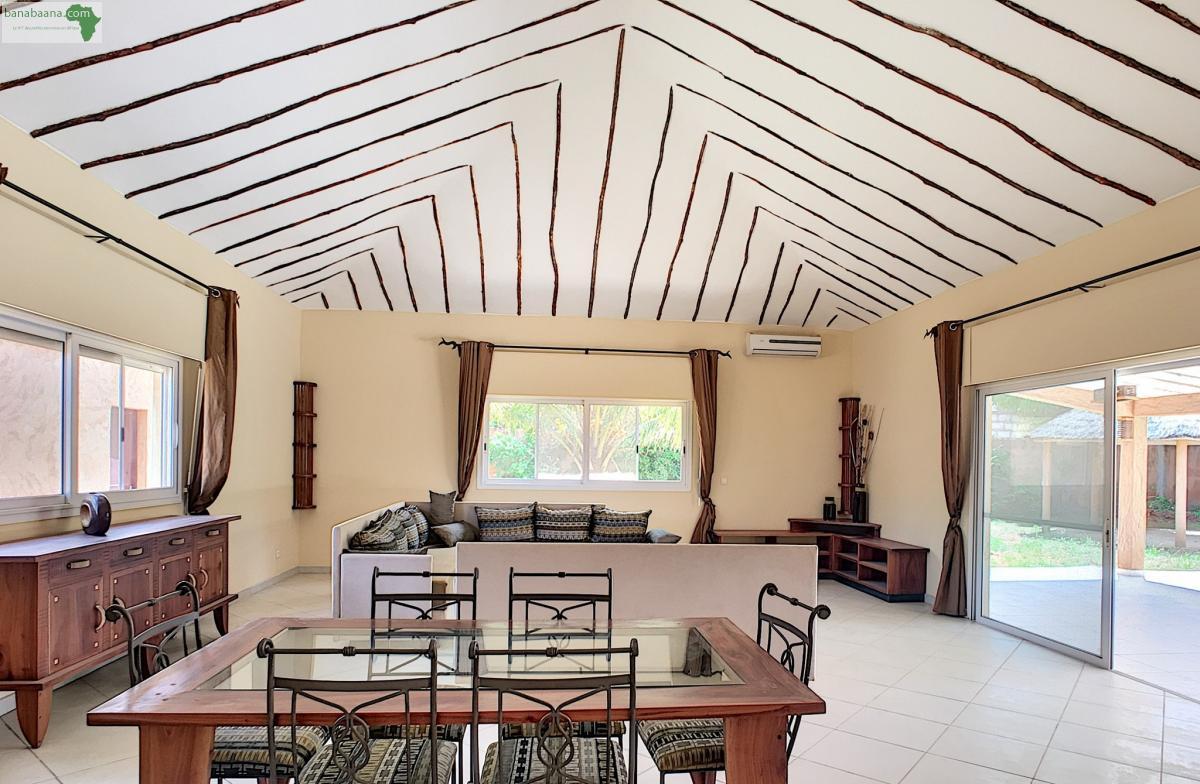 Villa récente Somone -173m²- 250m de la plage – 100m des grands axes Villa récente 173m² sur 750m² de terrain composée au RDC : salon-séjour, chambre avec SDE, cuisine équipée - aménagée. A l'étage 2 chambres avec SDE. Terrasse couverte - piscine - paillote - maison de gardien.