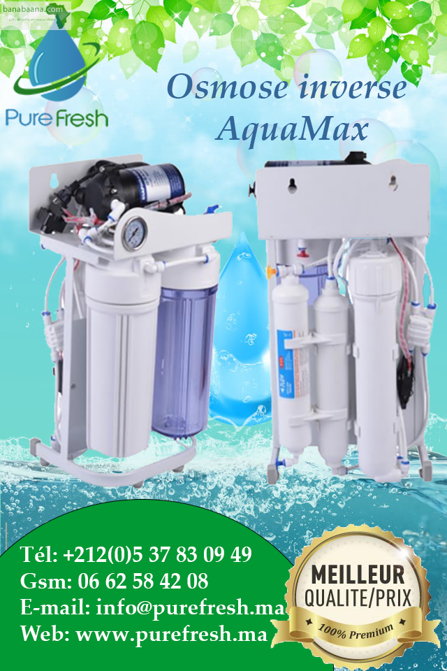 PURE FRESH vous présente pour la première fois au Maroc L’osmoseur AquaMax RO à 5 étapes avec manomètre et support ces dimensions idéales sont réduites pour ne pas occuper beaucoup d'espace sous l’évier et son architecture vous permet un changement facile des filtres il vous procure une eau idéale pour boire, préparer les biberons, cuisiner et pour laver vos fruits et légumes...